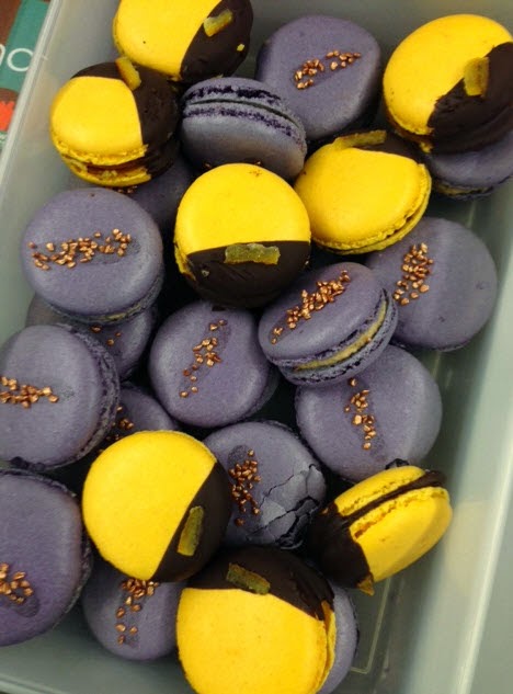 I made the shells in an orange/yellow colour and made some orange jelly and a dark chocolate ganache which i piped onto the jelly discs and sandwiched them together. I also made some candied orange peel for decoration (not worth the hard work by the way) and then i dipped half the macaron in melted 70% dark chocolate and added some orange peel.